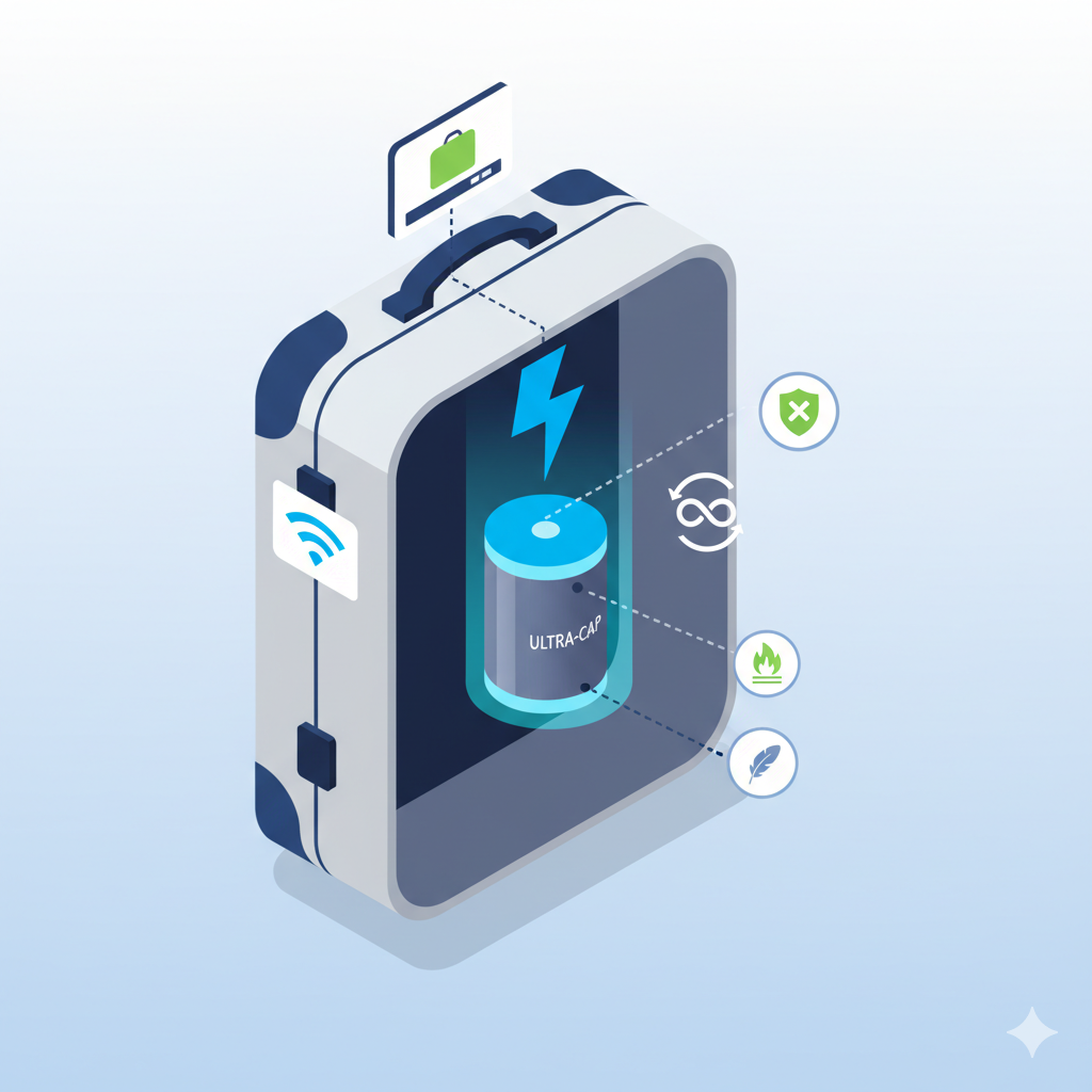 Supercapacitors are the safest option for power storage in luggage and offer significant safety advantages over all common battery types.